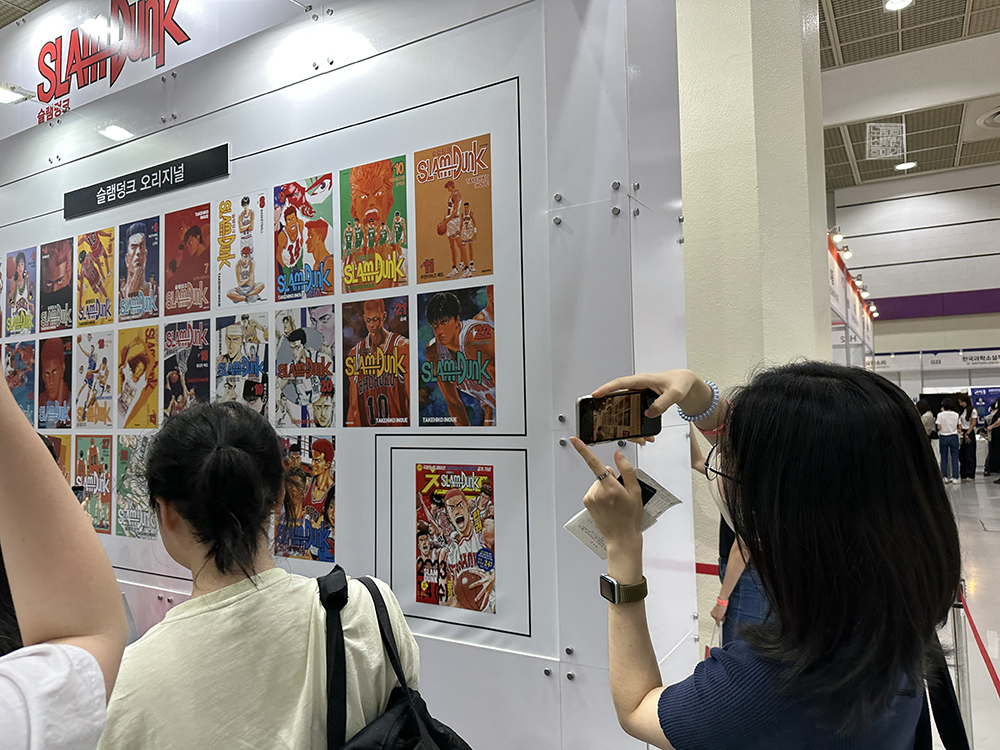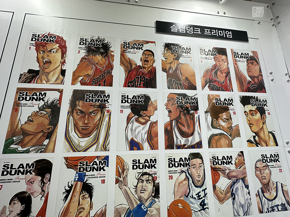 왼쪽으로 먼저 발걸음을 옮기면 조금 떨어진 곳에서 사람들이 북적거리는 부스를 발견할 수 있다. 바로 2023 서울국제도서전에서 슬램덩크 단독관을 운영하고 있는 대원씨아이 부스로, 대원씨아이는 이번에 여러 작품을 동시에 전시하는 것이 아니라 애니메이션 극장판을 통해 사람들의 높은 관심을 받은 <슬램덩크> 하나에 집중을 했었다.